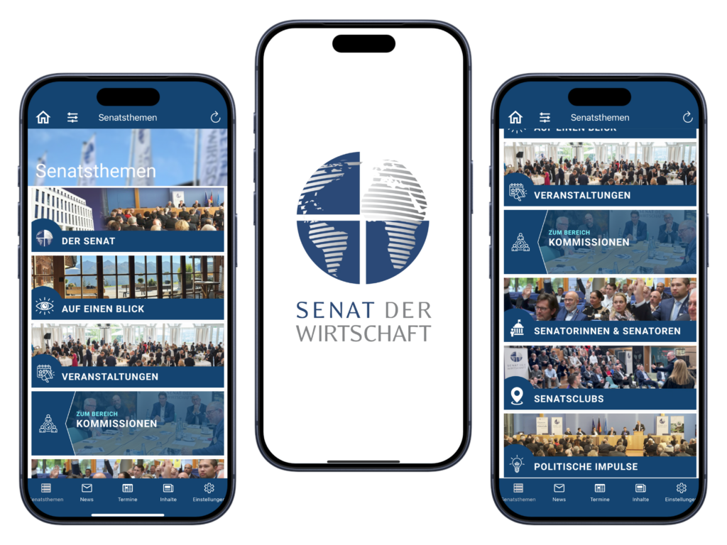 Ab Mitte Januar 2026 steht Ihnen unsere neue, exklusive und personalisierte Senat der Wirtschaft App zur Verfügung. Sie erhalten eine individuelle E-Mail mit persönlichem Zugangscode. Die APP bietet einen zentralen Zugang zu allen wichtigen Themen, Terminen und Inhalten. Übersichtlich, modern und jederzeit griffbereit ermöglicht es die App – unabhängig von Ort und Zeit, aktiv oder passiv – am Geschehen und am Leben des Senat teilzunehmen. So bleiben Sie jederzeit bestens informiert und aktiv eingebunden. Die App ist exklusive nur für Senatsmitglieder.